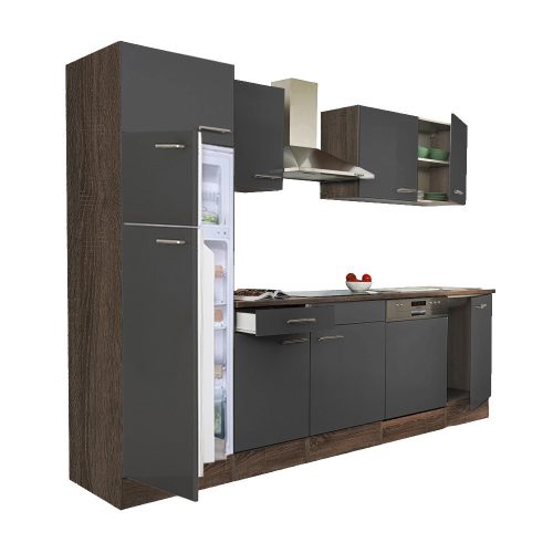 Yorki 280 konyhabútor yorki tölgy korpusz,selyemfényű antracit fronttal felülfagyasztós hűtős szekrénnyel