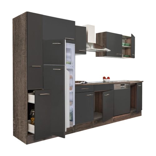 Yorki 310 konyhabútor yorki tölgy korpusz,selyemfényű antracit fronttal felülfagyasztós hűtős szekrénnyel