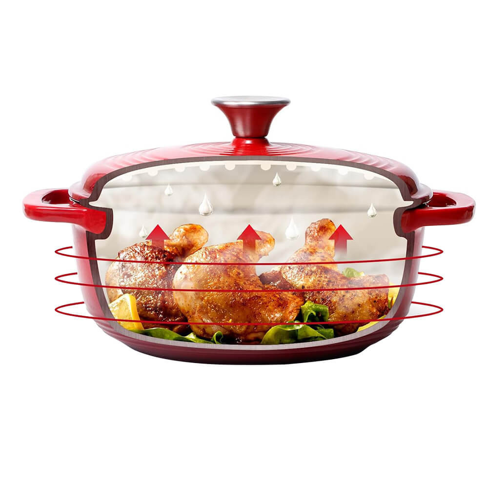 Ez az 5,7 literes öntöttvas edény zománc bevonattal rendelkezik, amely nemcsak tartós, hanem könnyen tisztítható is. Fedővel és masszív kialakítással bír, ráadásul sütőben is használható, így sokoldalú segítség a konyhában. A piros szín modern megjelenést kölcsönöz neki, így praktikus és mutatós egyben.
