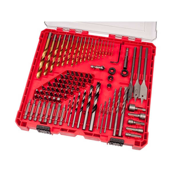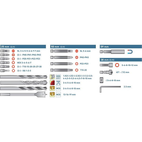 behajtó és fúró klt. 100 db Cr.V., lapos, PH, PZ, HEX, T és TTa illetve fa-, fém- és betonfúrók, műanyag tartóban