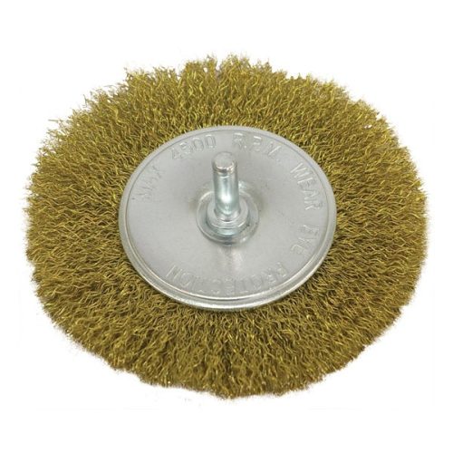 drótcsiszoló körkefe, 100 mm, fúrógépbe fogható: 6mm csap, rezezett acél, max. 4500 ford/perc