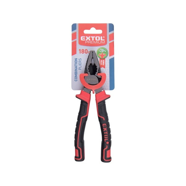 kombinált fogó, 180mm, duál vörös/fekete TPR nyél, 20% extra erőkifejtés, akasztós szerszámtartó