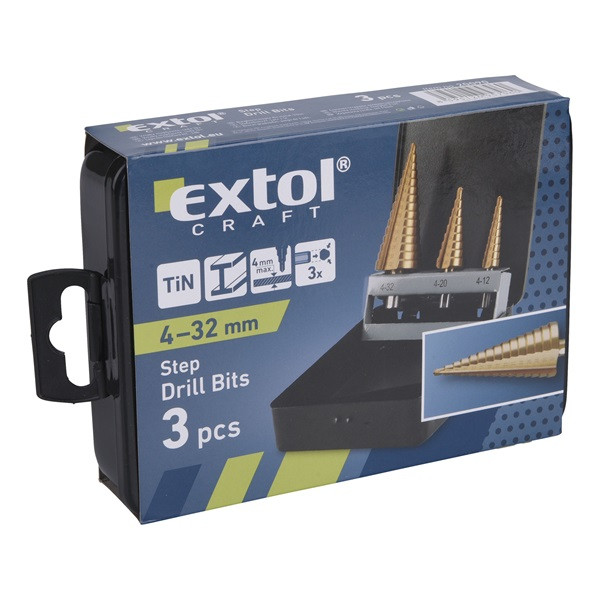 lépcsős fémfúró klt. 3db; (4-12mm/1mm lépcsők,4-20mm/2mm,4-32mm/2mm) befogás:10mm, max.4mm vastag anyagokhoz,TiN bevonat