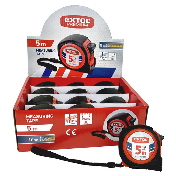 A gumiborítás és az ergonómikus csúszásgátló elemek megvédik a mérőszalag műanyag testét. Önfeltekercselő szerkezetnek erős rugója van. A STOP gomb csúszásgátló felületkezeléssel rendelkezik.Az íves profilú acél szalag sík helyzetben tartását segíti a mérőszalagnak.