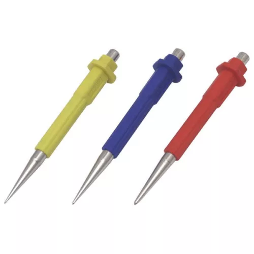 A pontozó kitűnő minőségű CrV acélból készült. Praktikus műanyag tartó. Az egyes méretek színjelöléssel vannak megkülönböztetve sérülés elleni védőelemmel ellátott markolat