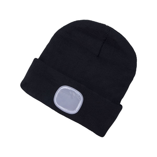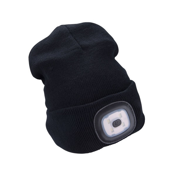 sapka, fekete, kötött, kivehető LED homloklámpával, 4×45 Lumen; USB tölthető Li-ion, 3funkció (100%-75%-50% fénye.)