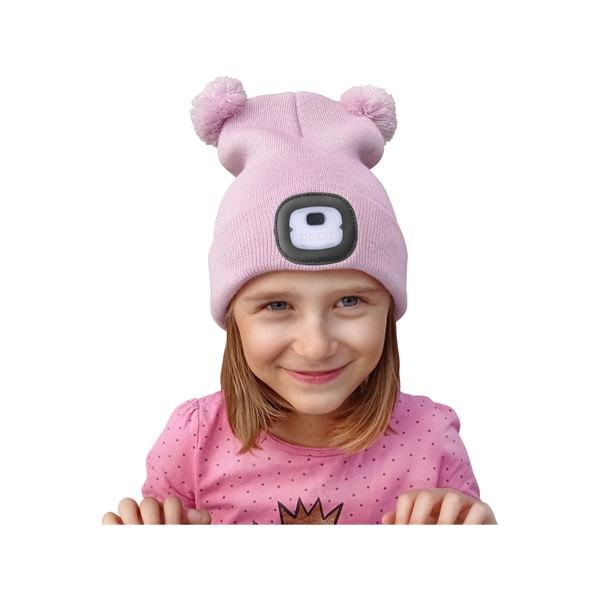 sapka, gyerek, rózsaszín, kötött, kivehető LED homloklámpával, 4×25 Lumen; USB tölthető Li-ion, 3funkció (100%-75%-50%)