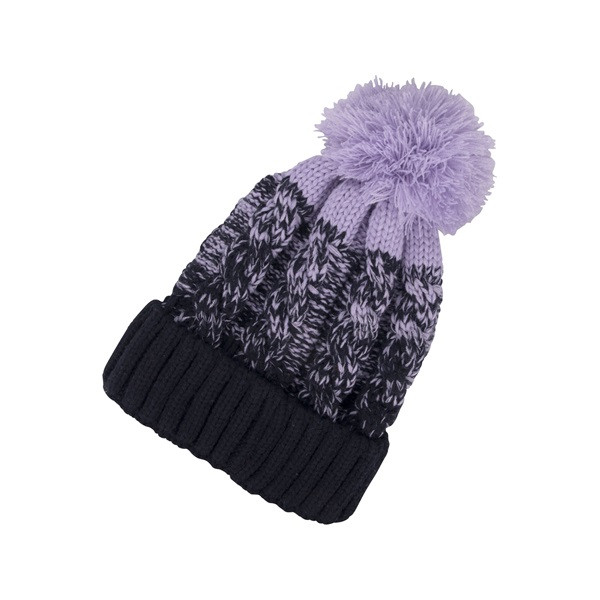 sapka, kék/lila pomponnal, kötött, kivehető LED homloklámpával, 4×45 Lumen; USB tölthető Li-ion, 3funkció (100%-75%-50%)