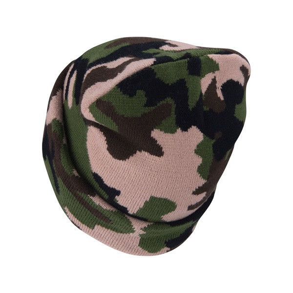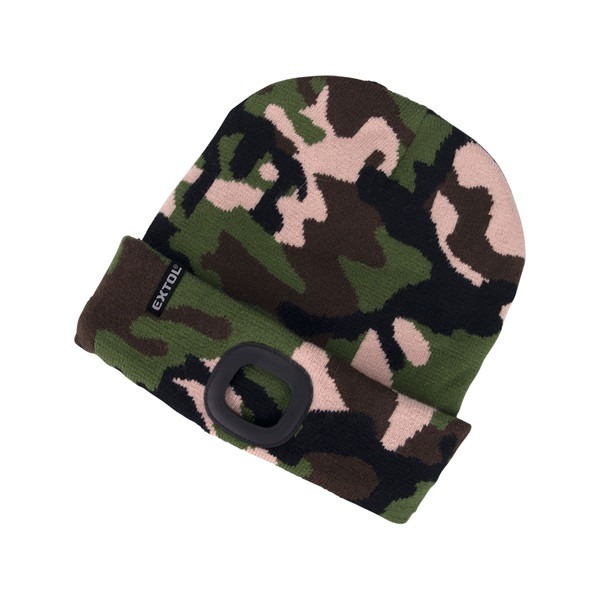 sapka, terepszínű, kötött, kivehető LED homloklámpával, 4×45 Lumen; USB tölthető Li-ion, 3funkció (100%-75%-50%)