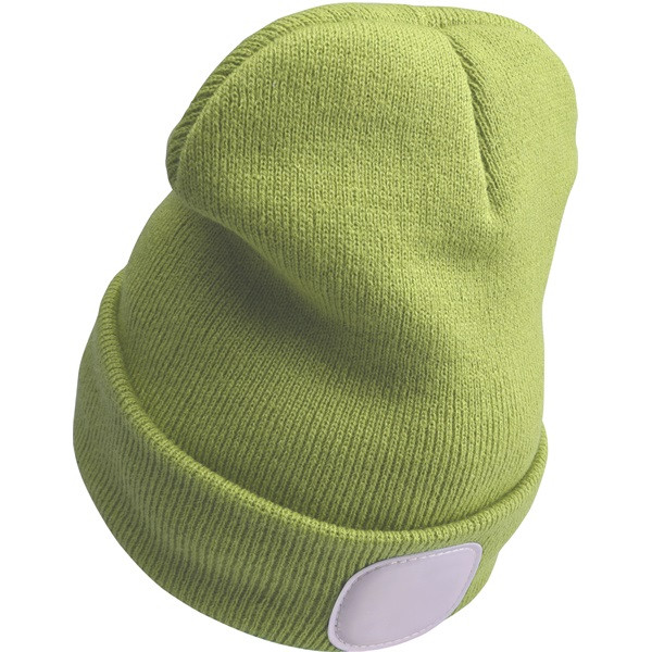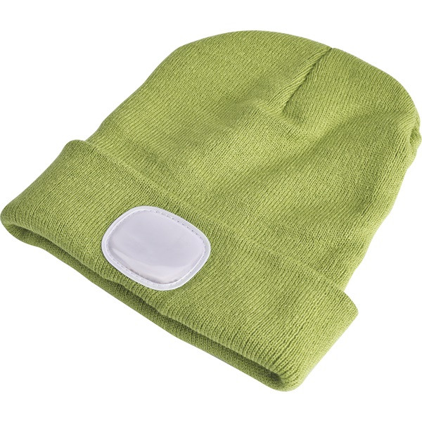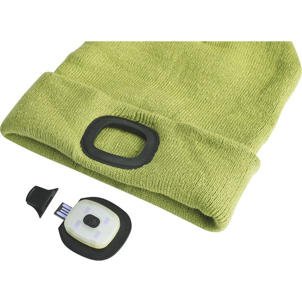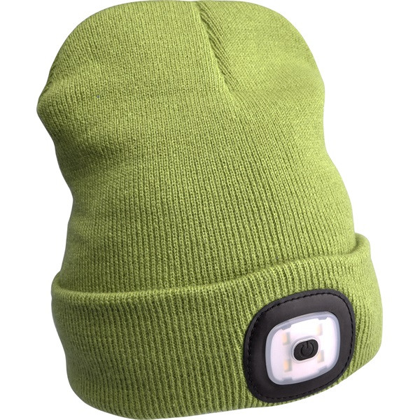 sapka, zöld, kötött, kivehető LED homloklámpával, 4×45 Lumen; USB tölthető Li-ion akku, 3 funkció (100%-75%-50% fényerő)