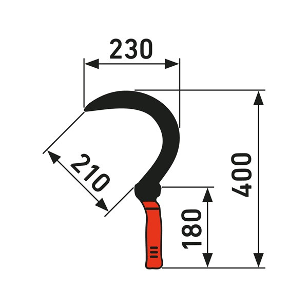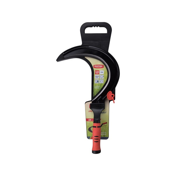 sarló, teljes/penge hossz: 400/230mm, kovácsolt acél penge, PP+TPR nyél, műanyag tartó
