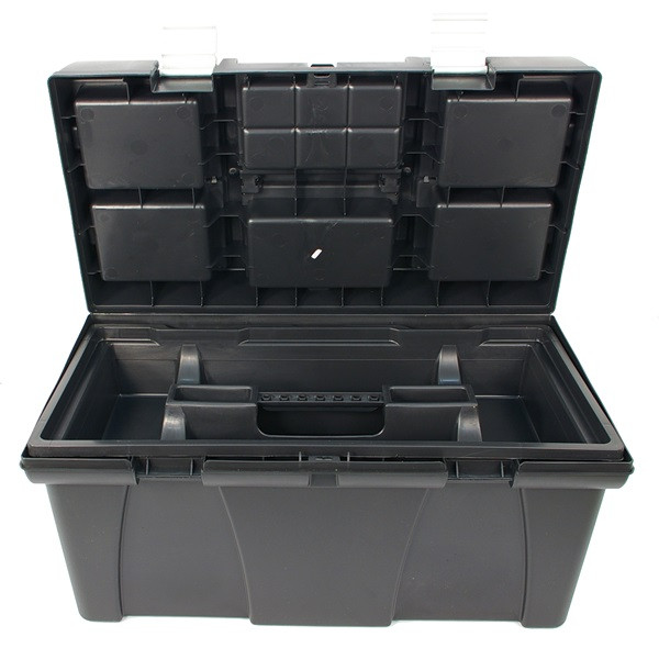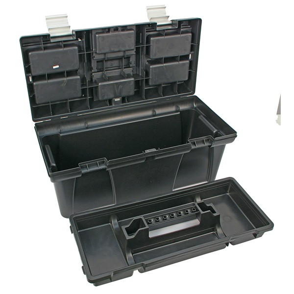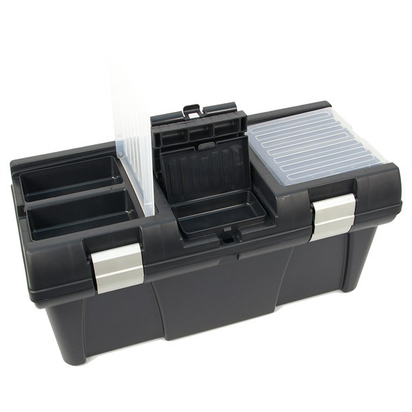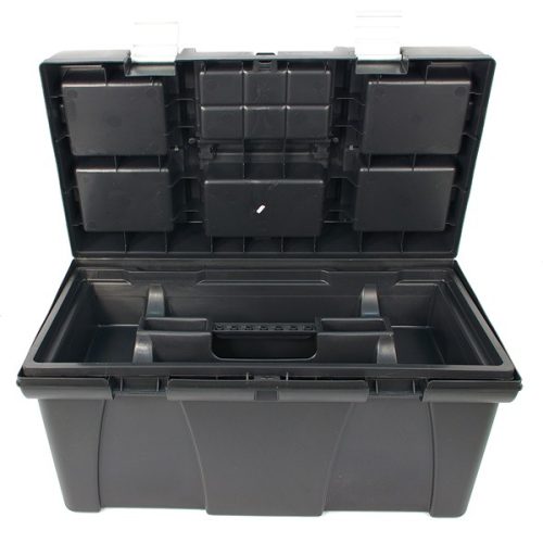 szerszámosláda, műanyag, alucsatos, tálcával, fekete, lakatolható; 20", 525×255×245mm, rendező felül