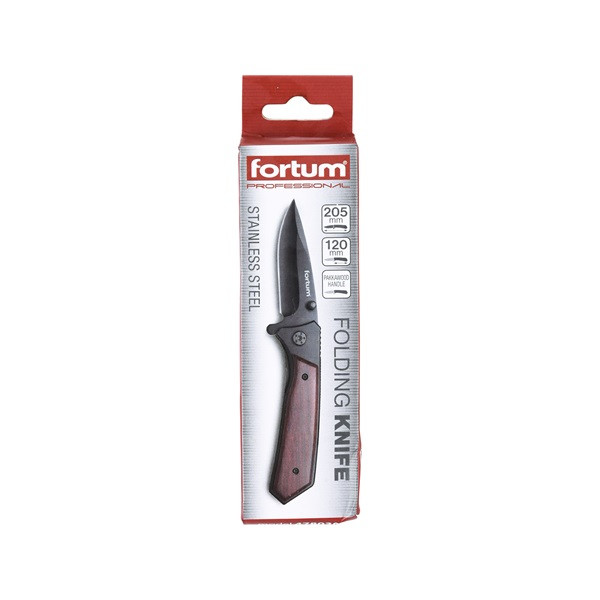 zsebkés, rozsdamentes fekete pengével, teljes/összecsukott hossz:205/120mm, pakkafa nyél, övre akasztható, rögzítővel