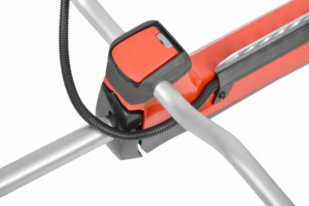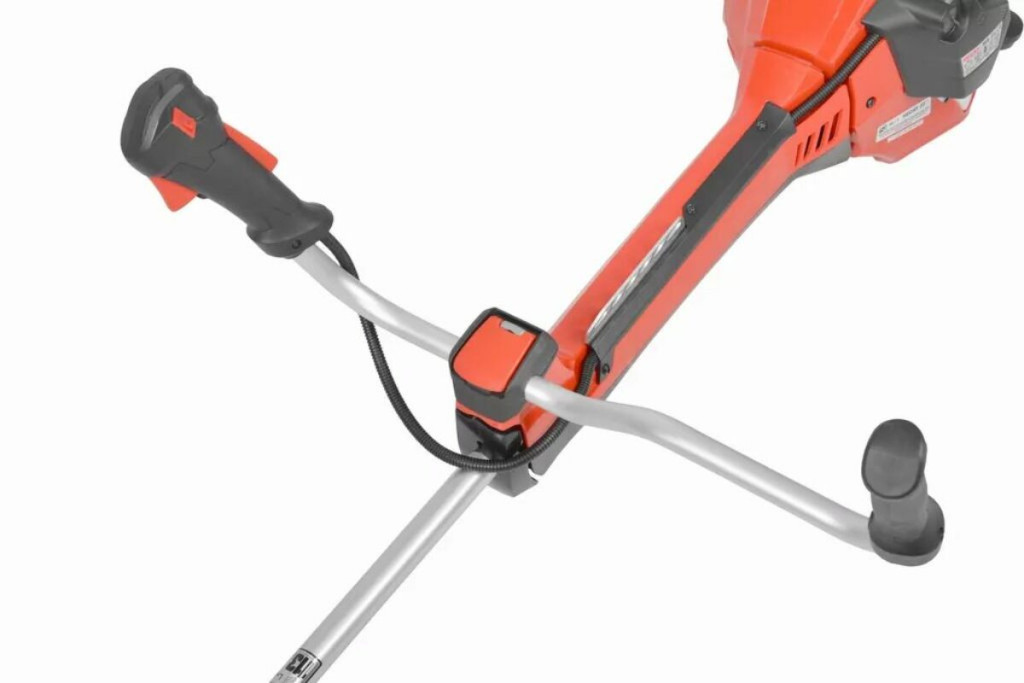 A kényelmes és biztonságos fogás érdekében a fogantyúk ergonomikus kialakításúak és csúszásmentes réteggel vannak ellátva, a gázkapcsoló pedig biztonsági retesszel is fel van szerelve. A teljes tökéletesen rugózott fogantyú egy gyorskioldó csavar segítségével egyszerűen és gyorsan a felhasználó alakjának megfelelő optimális szögbe állítható. A szilárd és állítható kétkarú akasztópántnak köszönhetően kellemes a munka a fűkaszával, és nem erőlködik feleslegesen.