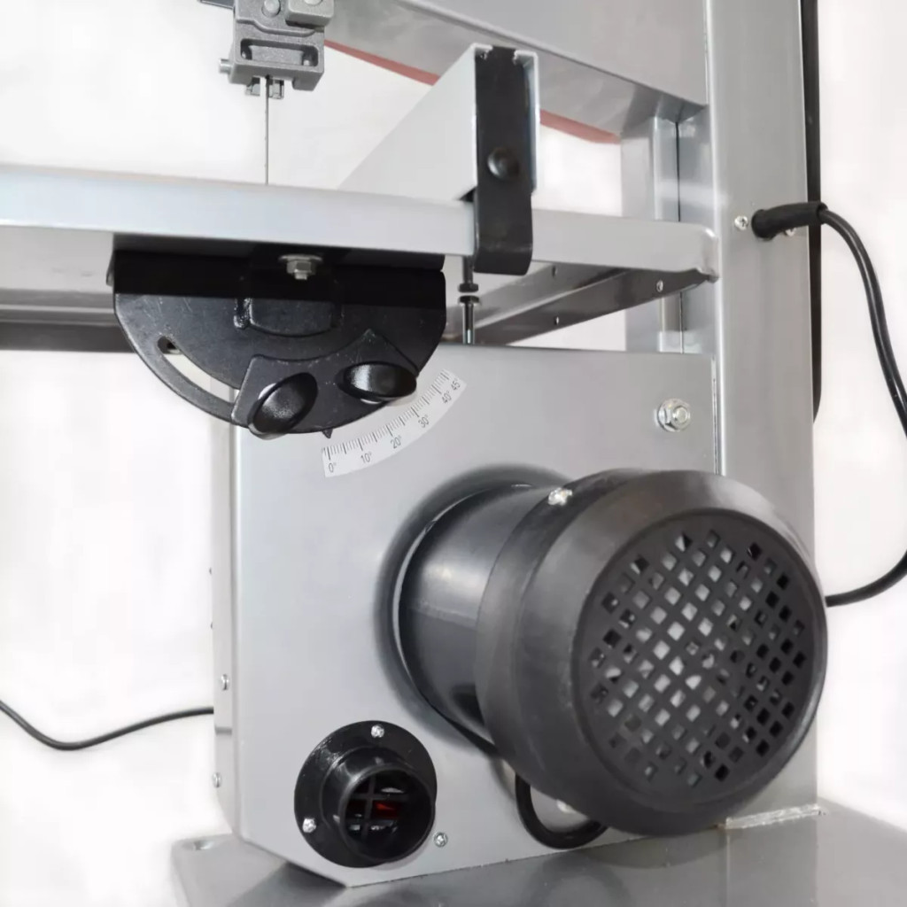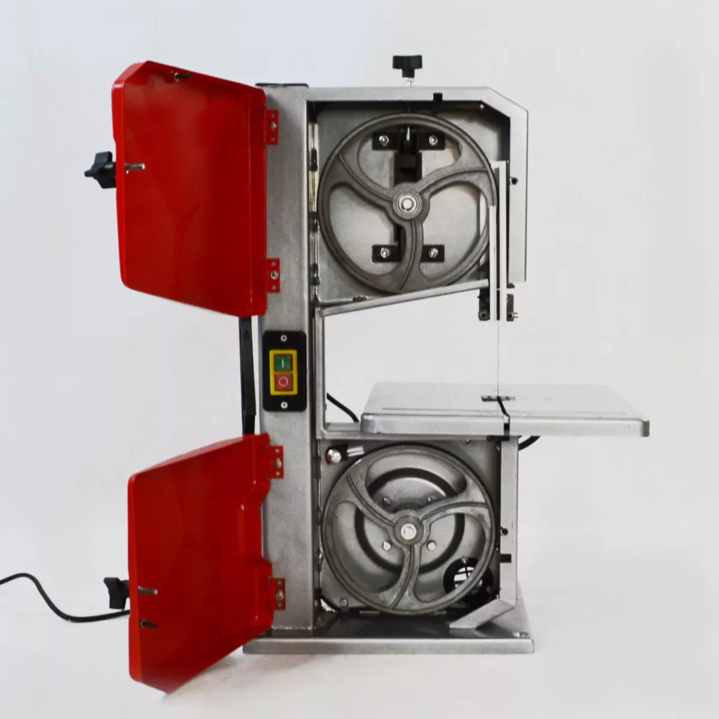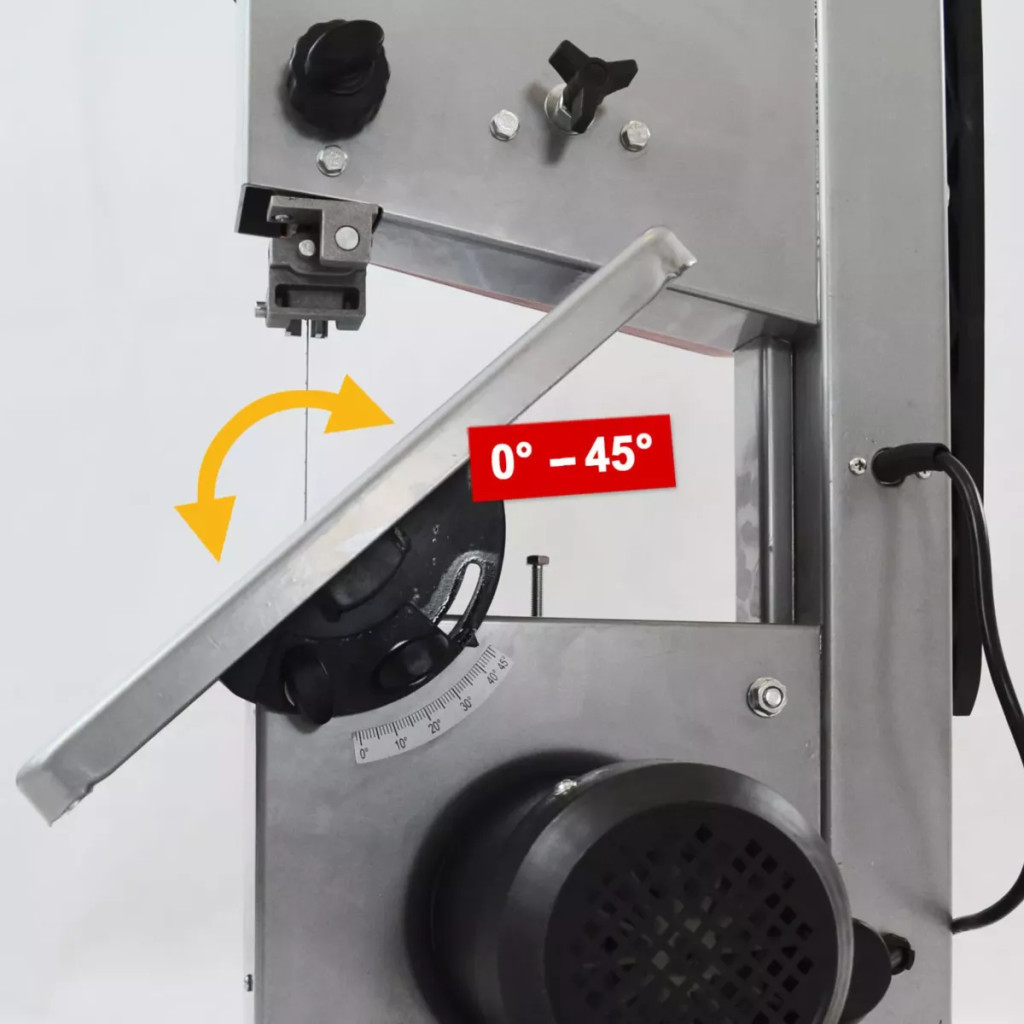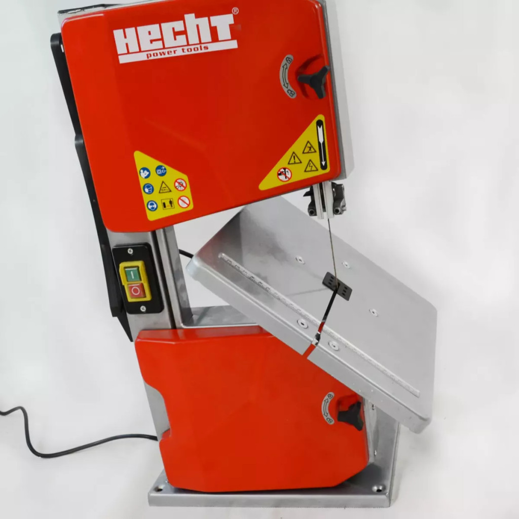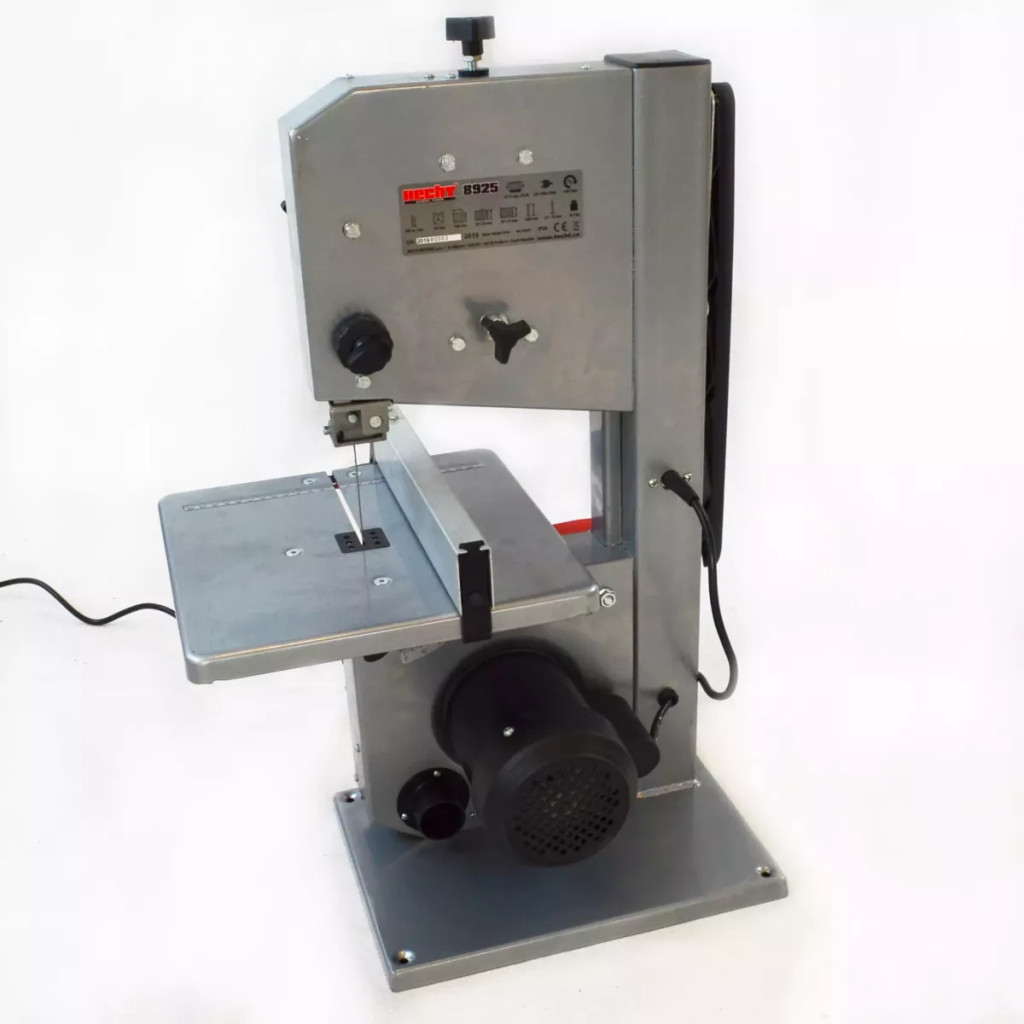 Asztali szalagfűrész, fogyasztás 250 W. Munkalap 302 x 304 mm, vágási magasság 80 mm. Vágási szög 0 ° - 45 °.