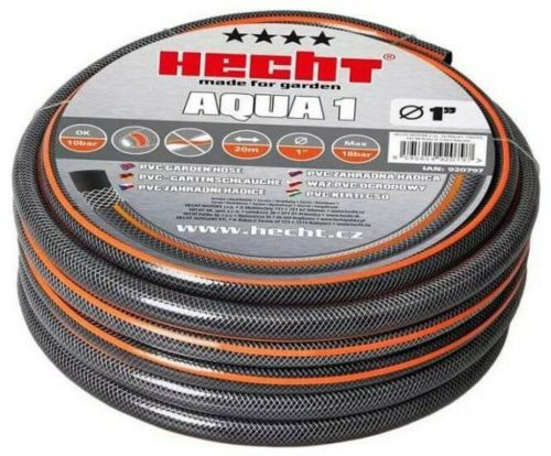 A HECHT AQUA egy tartós, háromrétegű PVC kerti locsolótömlő lágyított PVC és szintetikus szálak nyomásfonat kombinációjából. A belső fekete réteg megakadályozza az algák képződését és UV védelmet biztosít. A szintetikus szálak középső rétege nagy nyomásállóságot biztosít a tömlőnek. A külső sima réteg nagy kopásállóságot biztosít, és a tömlő jobban csúszik a talajon. A tömlő nagyon stabil alakú. A maximális nyomás legfeljebb  18 bar, a normál üzemi nyomás pedig 10 bar. A tömlő átmérője 1". A tömlő hossza 20 m .