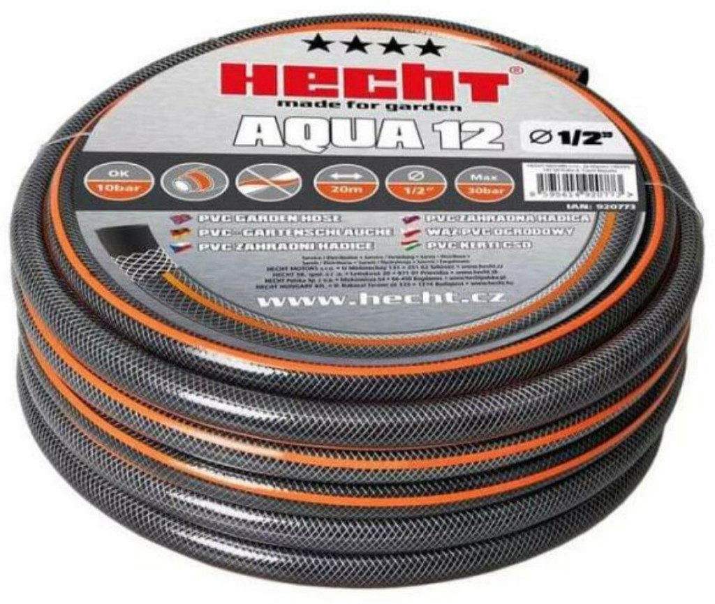 A HECHT AQUA egy tartós, háromrétegű PVC tömlő, amely lágyított PVC és műszálas nyomófonat kombinációjából készült. A belső fekete réteg megakadályozza az algaképződést és UV-védelmet biztosít. A műszálas középső réteg nagy nyomásállóságot biztosít a tömlőnek. A sima külső réteg nagy kopásállóságot biztosít, a tömlő pedig így jobban siklik a talajon. A tömlő nagymértékben formatartó. A maximális nyomás legfeljebb 30 bar, a normál üzemi nyomás 10 bar. A tömlő átmérője 1/2". A tömlő hossza 25 m.