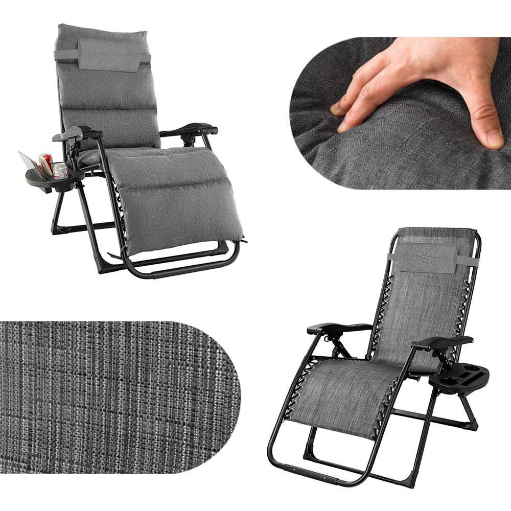 A párnázott zéró gravitációs szék ideális társ a pihenéshez, legyen szó nyári napozásról, délutáni olvasásról vagy akár esti beszélgetésekről a teraszon. Extra kényelmet biztosít a puha ülőfelület és a levehető fejpárna, miközben praktikus kiegészítői gondoskodnak arról, hogy minden fontos dolog kéznél legyen.