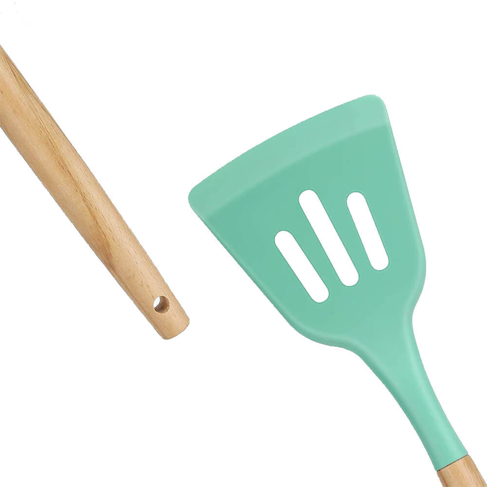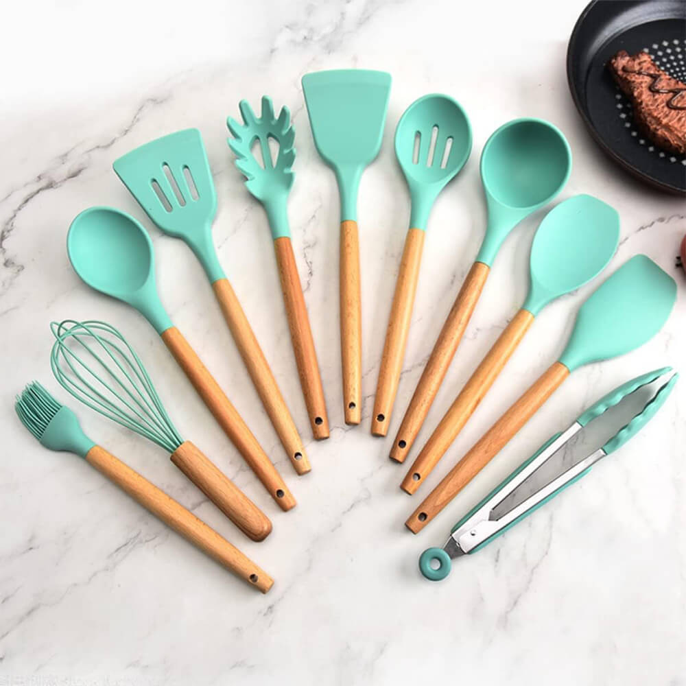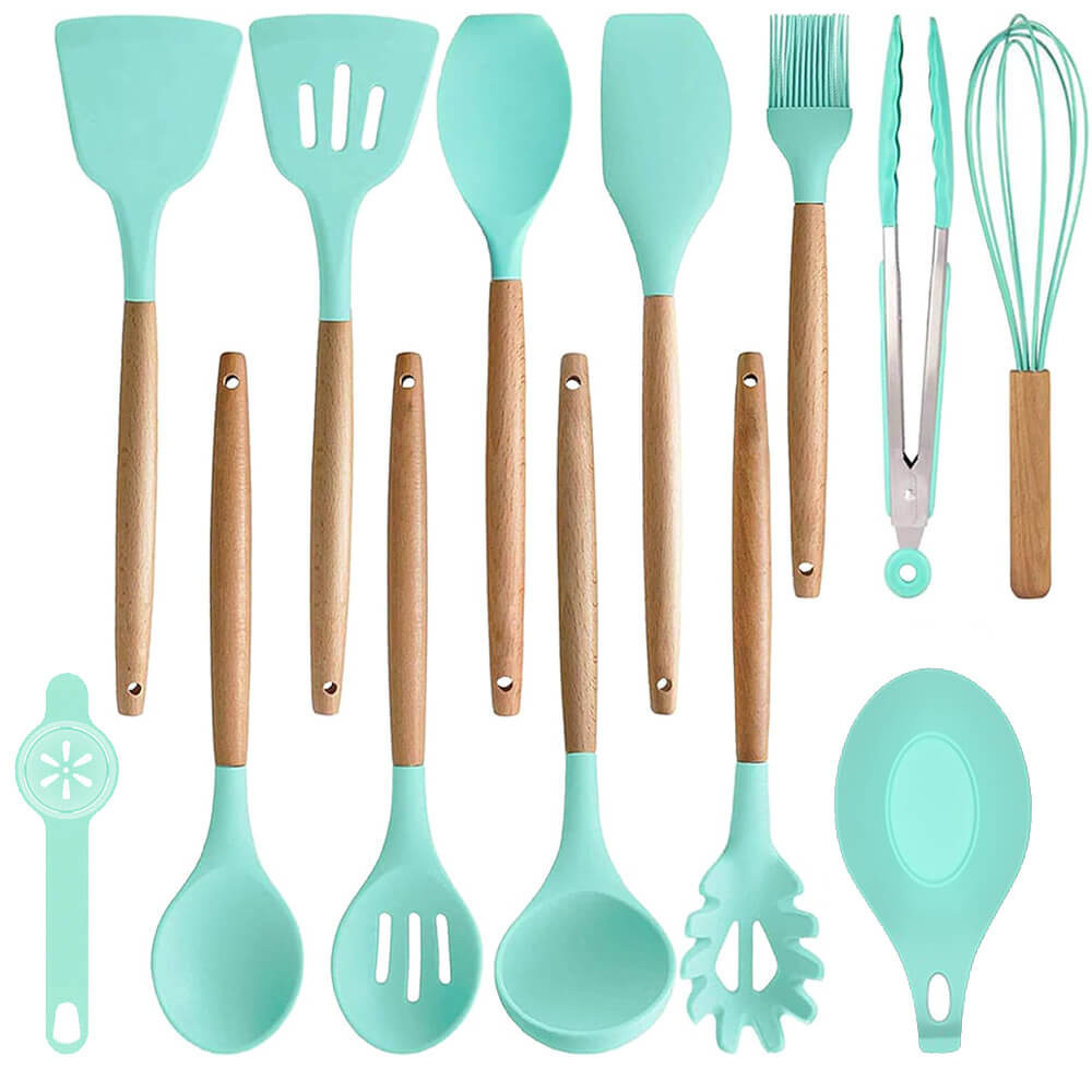 14 darabos konyhai eszközkészlet, hőálló szilikon fejjel, tartóval, türkiz