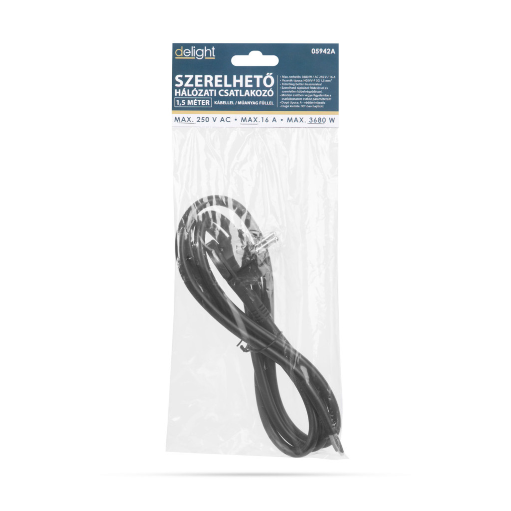 Hálózati szerelhető tápkábel dugóval - műanyag füllel - 1,5 m kábellel - 3 x 1,5 mm2 - fekete