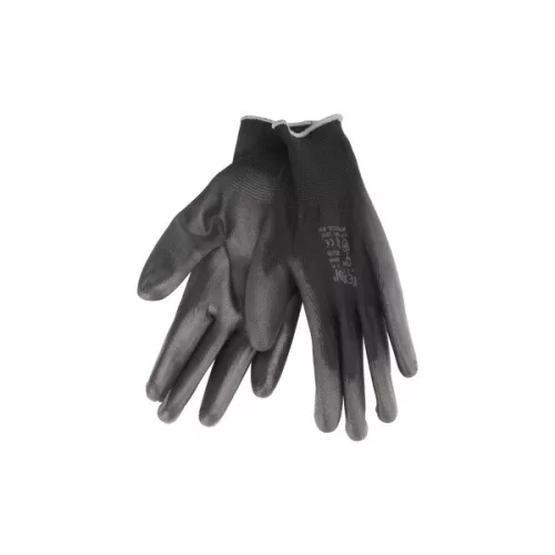 Kötött kesztyű fekete poliészter, méret: 8' poliuretánba mártott teny. és ujjhegy., gumírozott mandzsetta
