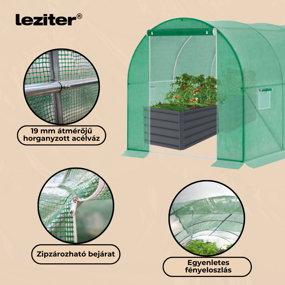 3. Stabil szerkezet: A horganyzott acélból készült váz ellenáll a korróziónak. Az oldalfalak végződése lehetővé teszi a talajjal való lefedést vagy kövekkel való nehezítést, ami növeli a szerkezet stabilitását.