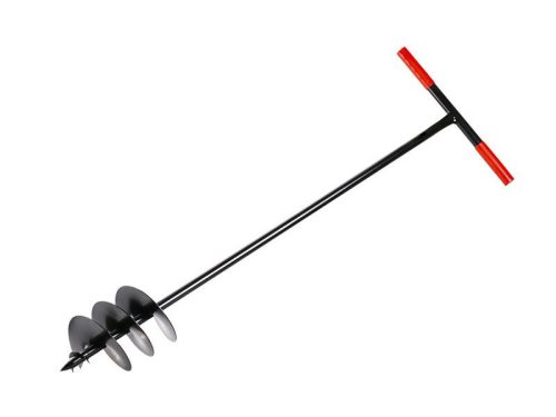 padlásfúró oszlopok, fakerítések, facsemeték stb. egyszerű felszereléséhez. méretek: átmérő 200 mm, csavarvonal hossza 30 cm, kar hossza 42 cm, teljes hossza 120 cm új csúcskialakítás a könnyebb záráshoz még megkeményedett talajban is