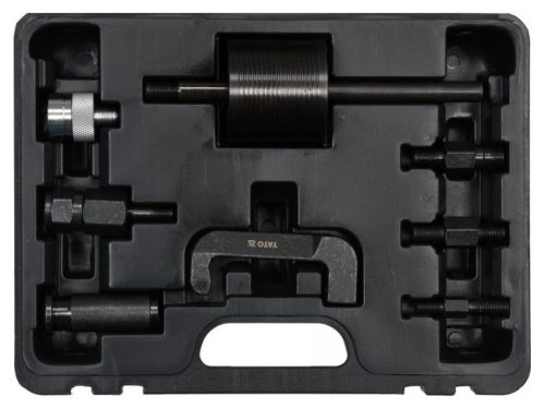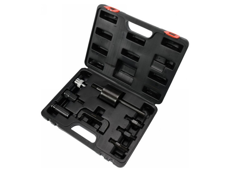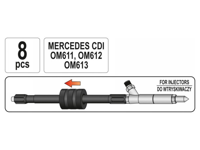 Professzionális készlet a gyorsan összesülő közös sínű üzemanyagrendszer-injektorok eltávolításához autók motorfejéről, mint például a Mercedes CDI. Alkalmazható olyan injektorokhoz, amelyeket a következő gyártók készítenek: Bosch, Denso, Delphi és Siemens. A készlet 8 elemet tartalmaz: inerciával működő kalapács, csuklós adapter nehézkesen hozzáférhető helyeken való munkavégzéshez és adapterek.
