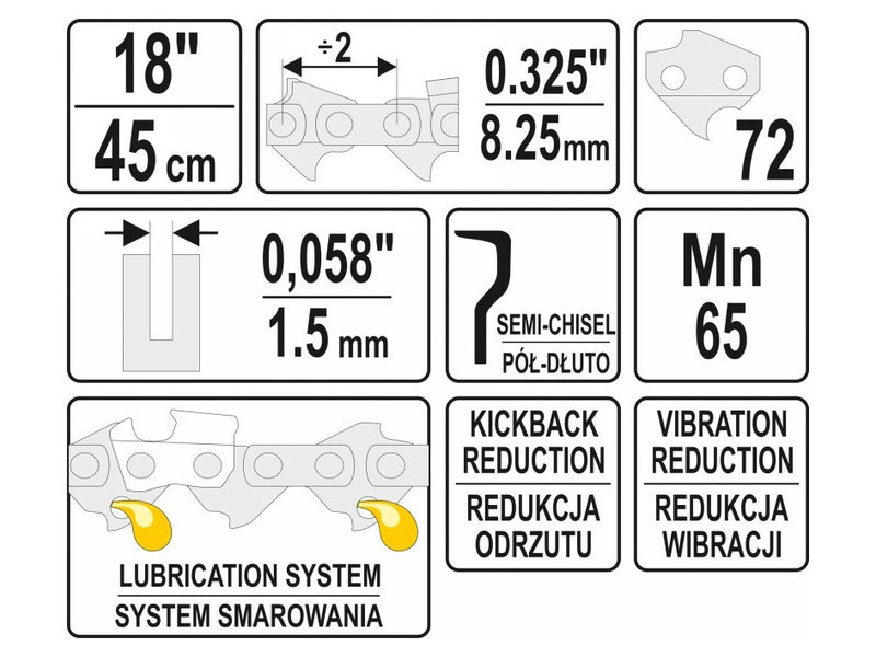 Vágólánc benzines és elektromos láncfűrészekhez YATO YT-849395.Hossza 18", 72 láncszem, osztás 0.325", szélesség 0.058" (1,5 mm).A vágófog pó33 típusú, nagy vágási sebességű. Tiszta és mérsékelten szennyezett fa vágására tervezték. Mn65 mangánacélból készült, ami növeli a törési szilárdságot, így jelentősen meghosszabbítja a lánc élettartamát.A YATO láncok számos egyedi rendszerrel rendelkeznek, amelyek növelik a biztonságot és a kényelmet:Kenési rendszer, amelynek köszönhetően az olaj egyenletesen oszlik el a sín teljes hosszán. Ez csökkenti a súrlódási ellenállást, csökkenti a sín felmelegedését és meghosszabbítja a teljes vágórendszer élettartamát.Rezgéscsökkentés - a vágófogak különleges kialakítása nem továbbítja a lánc rezgéseit a sínre, így a rezgésszint 25%-kal csökken. Ez jelentősen növeli a munkavégzés kényelmét, különösen hosszabb ideig tartó használat esetén.Visszarúgás csökkentése - úgynevezett KICKBACK - a speciálisan kialakított vezetőszemek csökkentik a visszarúgás kockázatát vágás közben, ami jelentősen növeli a munka biztonságát.A lánc "21" jelöléssel rendelkezik a szemeken, ami lehetővé teszi a paraméterek, mint például az osztás 0.325" és a szélesség 0.058" azonosítását.Különösen ajánlott a YATO útmutató YT-84936 használatához.Az tervezték benzines és elektromos láncfűrészekhez - különösen ajánlott a YT-84936 vezetősín használatához a YT-84900 láncfűrészhez. Ajánlott tiszta és közepesen szennyezett fa vágásához, mind otthoni, mind szakmai használatra. A YATO YT-84943 lánc használható a következő láncfűrészekhez: - Dolmar: 109, 110, 111, 112, 113, 114, 115i, 116, ES1800, PS460, PS4600, PS4605, PS500, PS5000, PS5510, PS5100S, PS540 - Husqvarna: 154, 257, 440e, 133, 136, 137, 140, 141, 142, 234, 235, 238, 240, 240e, 242, 242XP, 246, 254, 254XP, 261, 262, 338XPT, 339XP, 340, 345, 346, 346XP, 350, 351, 353, 357, 357XP, 359, 36, 365, 372XP, 40, 41, 42, 435, 435E, 44, 444, 445, 445E, 45, 450E, 455, RANCHER, 455E RANCHER, 460 RANCHER, 50, 51, 55, T435 - Jonsered: 520, 2012, 2014, 2015, 2016, 2036, 2040, 2041, 2045, 2050, 2051, 2054, 2055, 063, 2141, 2145, 2147, 2149, 2150, 2152, 2153, 2155, 2156, 2159, 2163, 370, 380, 410, 420, 425, 435, 45, 450, 451, 451EVS, 452, , 455, 490, 49SP, 50, 51, 510, 52, 521, 525, 535, 590, CS2149W,, CS2152W - Makita: 45, DCS430, DCS43001, DCS4300I, , DCS431, DCS460, DCS4600S, DCS4630, DCS500, DCS5000, DCS5030, DCS520, DCS5200I - NAC: NO-CS38, SPS01-45, SPS01-52, SPS02-45, YD 40/45, YD40, YD52 - Oleo-Mac: 850, 938, 940, 941, 942, 945, 946, 947, 950, 950 Super, 950A, 951, 952, 956, , 962, E300F - Partner: 1650, 365, 400, 405, 410, 450, 460, 465, 470, 495, 500, 510, 540, 545, P500, P5000, P5500" Használati figyelmeztetések: Figyelem! Munka közben mindig használjon személyes védőfelszerelést.