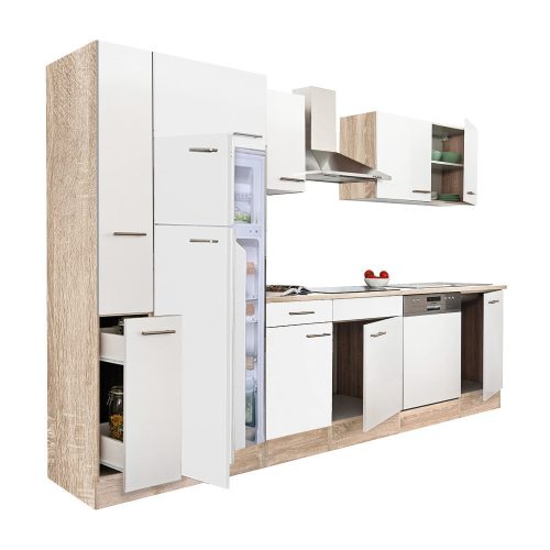Yorki 310 konyhabútor sonoma tölgy korpusz,selyemfényű fehér fronttal felülfagyasztós hűtős szekrénnyel