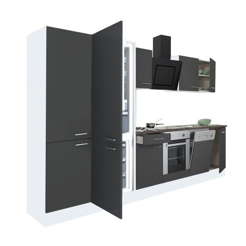 Yorki 340 konyhabútor fehér korpusz,selyemfényű antracit front alsó sütős elemmel polcos szekrénnyel és alulfagyasztós hűtős szekrénnyel