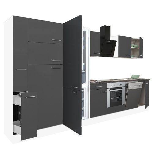 Yorki 370 konyhabútor fehér korpusz,selyemfényű antracit front alsó sütős elemmel polcos szekrénnyel és alulfagyasztós hűtős szekrénnyel