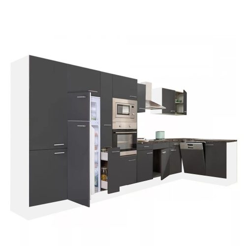 Yorki 430 sarok konyhabútor fehér korpusz,selyemfényű antracit fronttal felülfagyasztós hűtős szekrénnyel