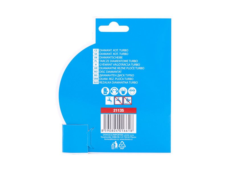 Gyémánt tárcsa DIAMANT, kialakítás: TURBO, minőségi anyagok és megmunkálás, speciális gyémánt szegmensek formája és felépítése és szilárd rögzítése a tárcsa tartótárcsájához, magas gyémántpor tartalom, felhasználás: beton, vasbeton száraz és nedves vágásához, tégla, falazat, kő, csomagolás: eurólyukkal ellátott buborékfólia, mellékelt szűkítő gyűrű 22,2-től 20 mm-ig, méretek: a termék megnevezésében.