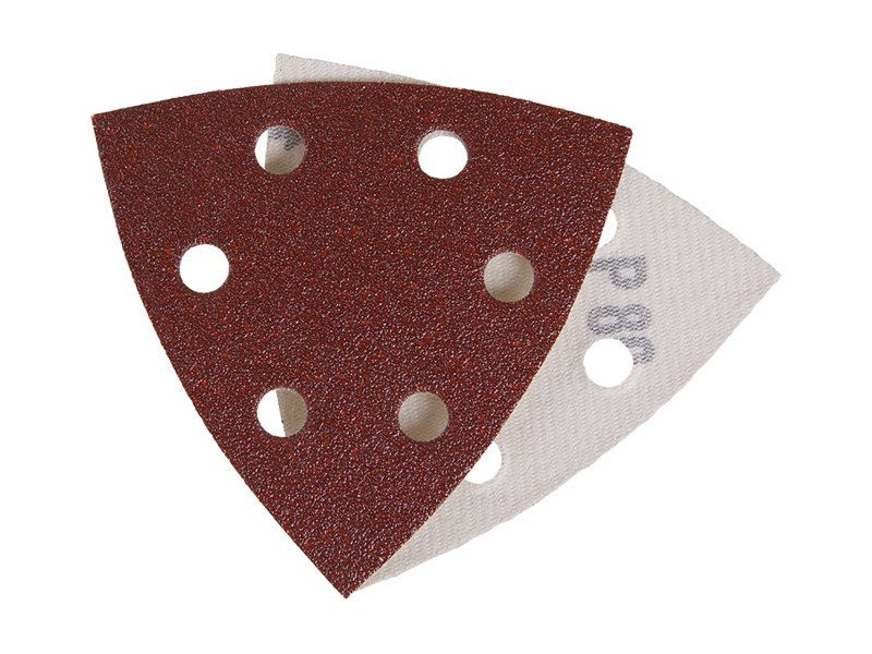 Csiszolólap tépőzáras háromszög alakú 94x94x94 mm, 6 szívónyílás. OSA minősítés, Kötőanyag: műgyanta, Szemcse típusa: korund, Aljzat: E, Felhasználás: fa, acél, színesfémek, festékek, lakkok, bőr. 5 db-os kiszerelésben.