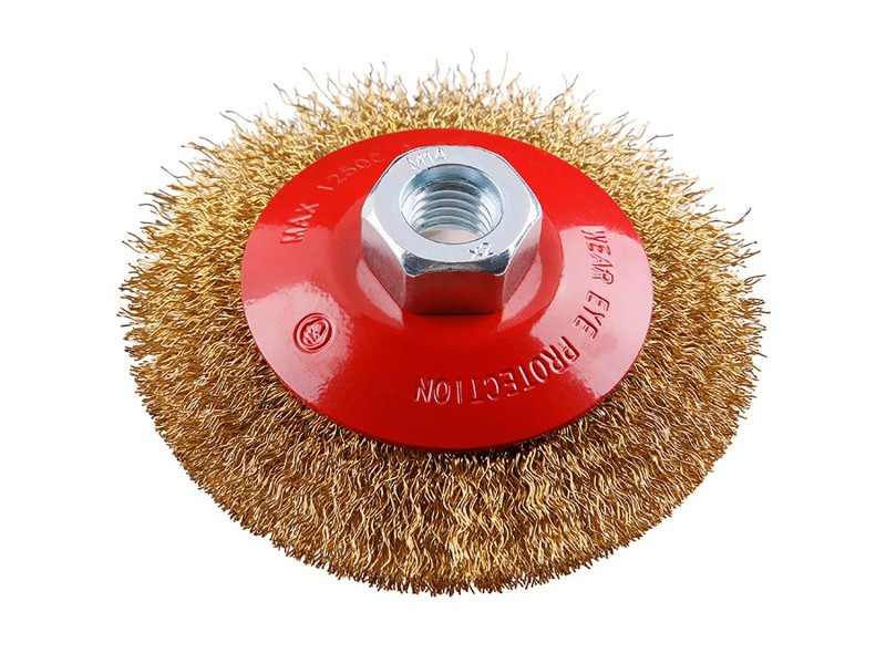 Forgókefe - csésze, FESTA kefe kiváló minőségű anyagokat és kidolgozást garantál, hullámos huzal - sárgaréz bevonat 0,3 mm, átmérő 100 mm, rögzítés M14*2, huzalok száma 1800, huzalhossz 19 mm, maximális fordulatszám percenként. 12500, felhasználás: rozsda eltávolítására, festékre, polírozásra..., csomagolás: euro lyukkal ellátott papírdoboz.