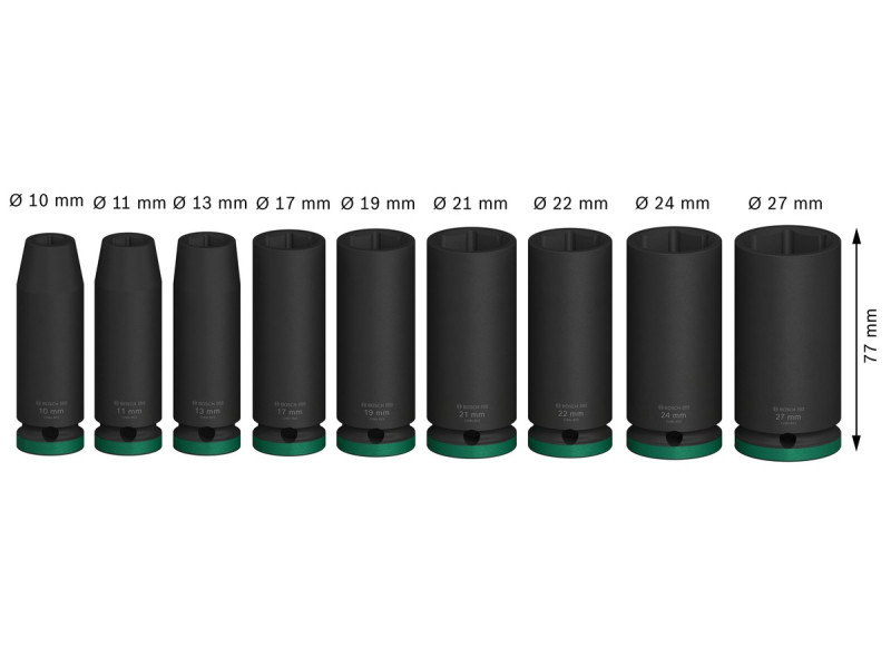 Erőteljes csavarozás Króm-molibdén acél a nagy nyomatéknak való ellenállás érdekében A foszfátbevonat megvédi a foglalatot a rozsdától és a korróziótól A készlet tartalma: Kulcsnyílás: 10 mm; hosszúság: 77 mm Kulcsnyílás: 11 mm; hosszúság: 77 mm Kulcsnyílás: 13 mm; hosszúság: 77 mm Kulcsnyílás: 17 mm; hosszúság: 77 mm Kulcsnyílás: 19 mm; hosszúság: 77 mm Kulcsnyílás: 21 mm; hosszúság: 77 mm Kulcsnyílás: 22 mm; hosszúság: 77 mm Kulcsnyílás: 24 mm; hosszúság: 77 mm Kulcsnyílás: 27 mm; hosszúság: 77 mm