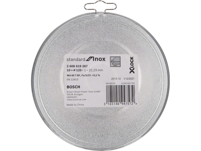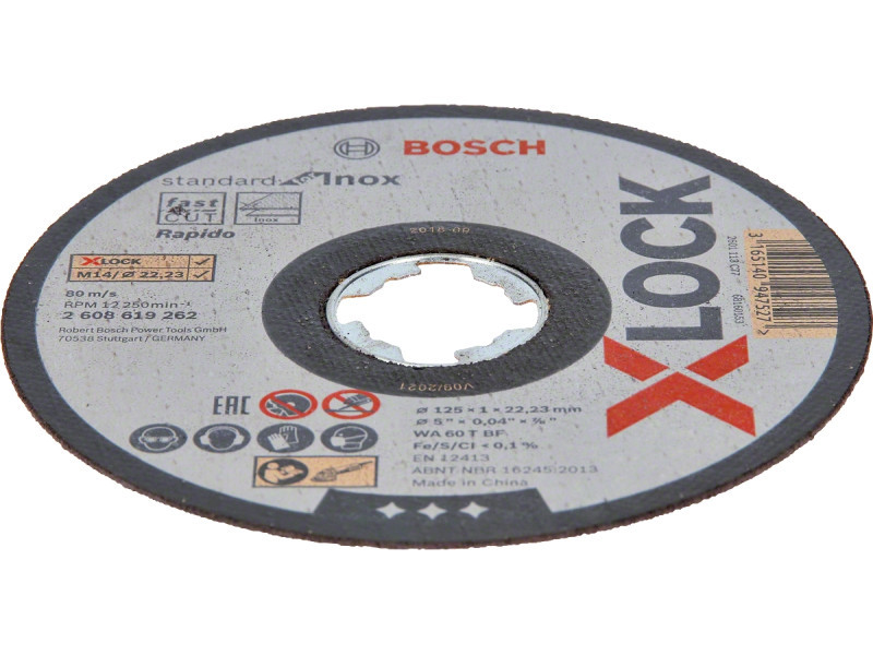 Megbízható teljesítmény Inox anyagoknál - Az X-LOCK Standard for Inox vágótárcsa megbízható teljesítményt nyújt Inox anyagoknálVékony vágóéle simán és könnyen vágEmellett a tárcsa nem tartalmaz sem vas- és kéntartalmú, sem klórozott töltőanyagotA Bosch vágótárcsák a szigorúbb biztonsági követelményeknek is megfelelnek, teljesítik például az EN 12413 előírásaitAz X-LOCK vágótárcsák a standard sarokcsiszolókkal is használhatókA vágótárcsák cseréje gyors és kényelmes, a kulcs nélküli X-LOCK rendszernek köszönhetően22,23 mm-es furattal normál rögzítőanyás sarokcsiszolókhoz