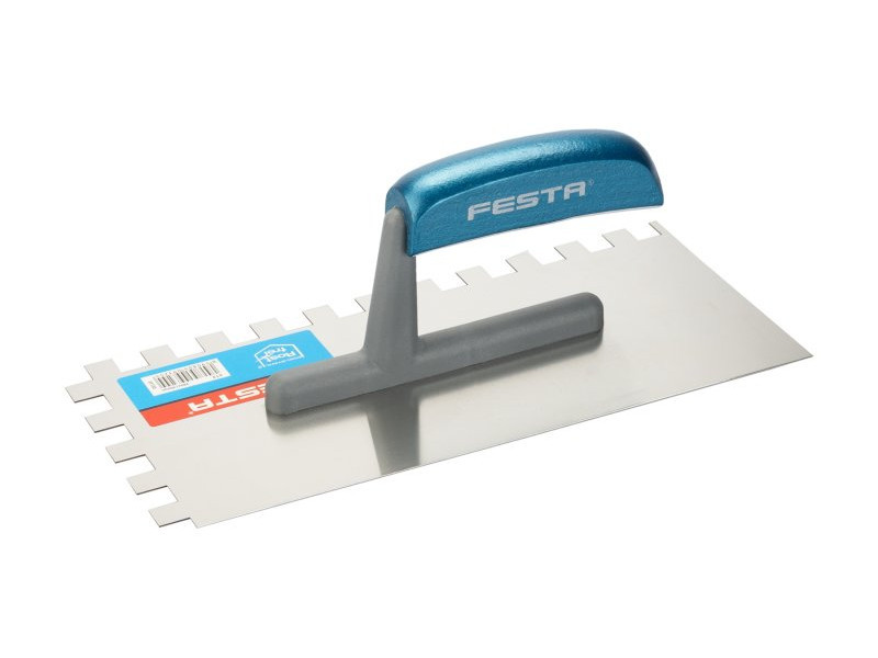 Rozsdamentes fogazott simító FESTA 280x130 mm, e12 fog, fa nyéllel, lemezvastagság 0,8 mm. Elsősorban csempék és burkolatok alá ragasztók felhordására, valamint esztrichek, stukkó, vakolatok, tömítőanyagok és egyéb építőanyagok felhordására használják. A rozsdamentes fogazott simító lehetővé teszi a ragasztó vagy építőanyag nyújtását csíkokban és a simító fogának megfelelő magasságban.