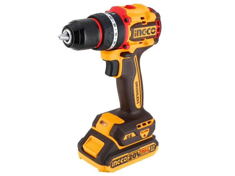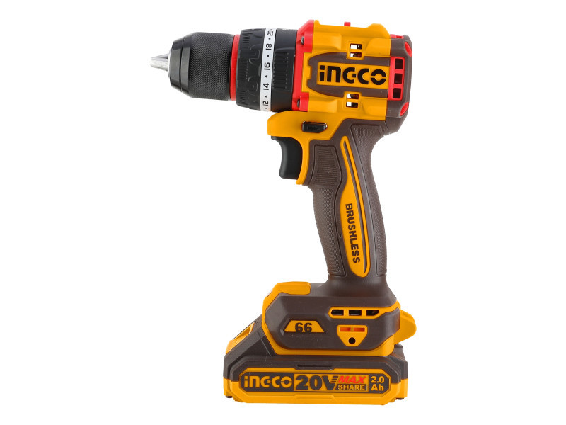 INGCO Akkus ütvefúró-csavarozó 66 Nm szénkefe nélküli 20 V (2 x 2,0 Ah akku + töltő)