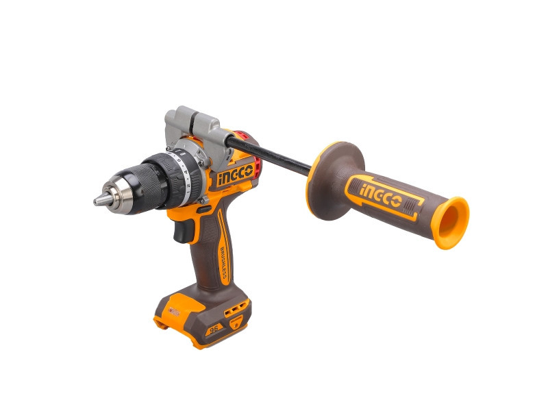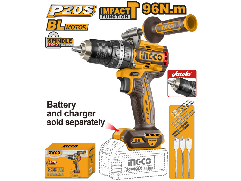 INGCO akkus ütvefúró-csavarozó 96 Nm, szénkefe nélküliAz INGCO 96 Nm nyomatékú akkus ütvefúró-csavarozó nagy teljesítményű, sokoldalú szerszám fúrási és csavarozási feladatokhoz. A szénkefe nélküli motor nagyobb hatásfokot, hosszabb élettartamot és alacsonyabb karbantartási igényt biztosít.A kétfokozatú mechanikus sebességváltó lehetővé teszi a fordulatszám és a nyomaték optimális beállítását különböző anyagokhoz. A 96 Nm maximális nyomaték erőteljes csavarozást és nagy átmérőjű fúrásokat is lehetővé tesz. Az ütvefúró funkció akár 31 500 ütés/perc értékkel hatékony fúrást biztosít falazatban.A masszív, 13 mm-es Jacobs fém tokmány stabil szerszámbefogást nyújt, míg az oldalfogantyú nagyobb kontrollt biztosít nagy terhelésű munkák során. Főbb előnyökSzénkefe nélküli motor a hosszabb élettartamért96 Nm maximális nyomaték nagy terhelésű feladatokhozÜtvefúró funkció falazathozKétfokozatú mechanikus sebességváltó13 mm-es Jacobs fém tokmányBeépített LED munkalámpaLED akkumulátor töltöttségjelzőOldalfogantyú a stabilabb fogásért Technikai adatokMotorszénkefe nélküliFeszültség20 VÜresjárati fordulatszám0–550 / 0–2100 ford/percMax. ütésszám31 500 ütés/percMax. nyomaték96 NmTokmányJacobs fém tokmányTokmánybefogás13 mmNyomatékfokozatok22+1+1Sebességváltómechanikus, 2 fokozatOrsórögzítésigenBeépített LED munkalámpaigenLED akkumulátor töltöttségjelzőigen Tartozékok: 3 db lapos fafúró (16, 19, 22 mm)3 db kőzetfúró (5, 6, 8 mm)3 db HSS csigafúró (4, 5, 6 mm)2 db 65 mm impact bithegy (PH2+PH2, PH2+SL6)1 db oldalfogantyúAkkumulátor és töltő külön kaphatóCsomagolás: színes dobozban