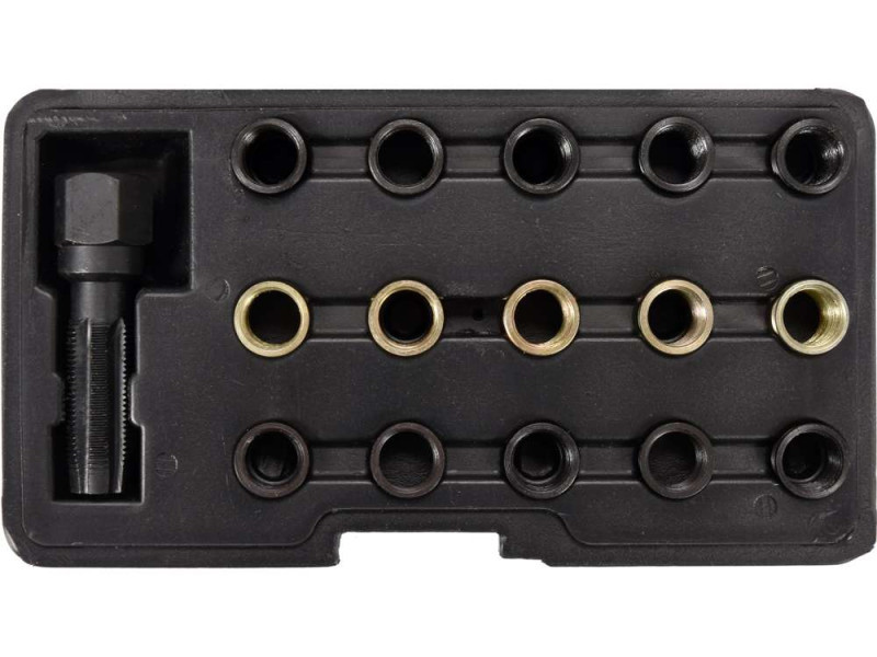 Professzionális gyertyamenet javító készlet, ami tartalmaz: tizenöt menetes betétet (női menet M14x1.25) M16x1.25 menetvágót Egy olyan készlet, amely az autószerelő műhelyek és javító szolgáltatások számára készült. Lehetővé teszi a gyertyamenetek felújítását és javítását. A magas minőségű kivitelezés hosszú élettartamot garantál. Az egész készlet egy műanyag dobozban található a könnyű szállítás és tárolás érdekében.
