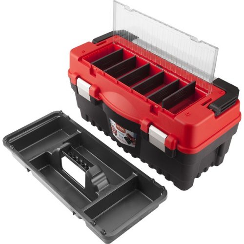 szerszámosláda, műanyag 547×271×278mm, fémcsatos, tálcával, lakatolható