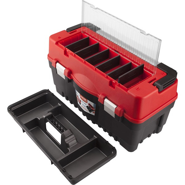 szerszámosláda, műanyag 595×289×328mm, fémcsatos, tálcával, lakatolható