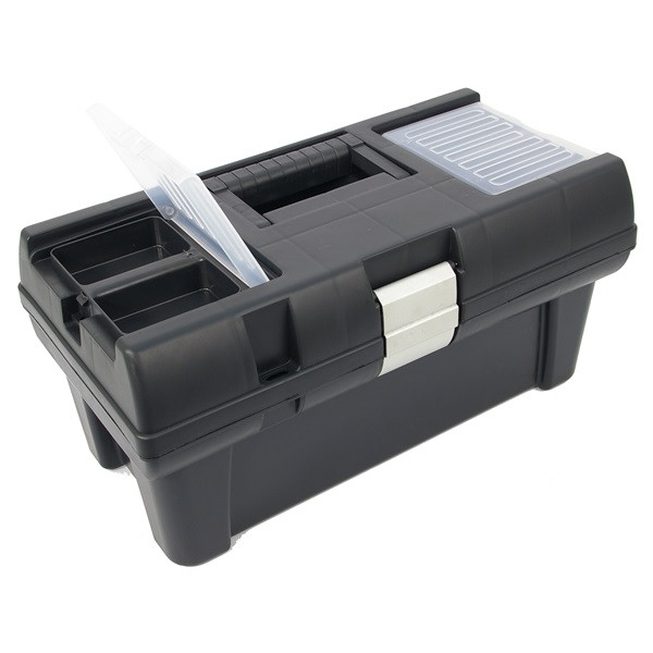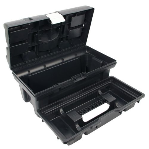 szerszámosláda, műanyag, alucsatos, tálcával, fekete, lakatolható; 16", 415×220×200mm,  rendező felül