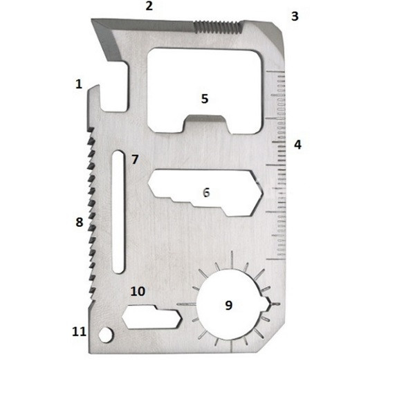 Funkciók: 1. konzervnyitó, 2. penge 3. lapos csavarhúzó, 4. vonalzó, 5. sörnyitó, 6. 4 különböző méretű villáskulcs csavarokhoz és anyákhoz, 7. szárnyas anyákhoz való nyílás, 8. Fűrész, 9. Égtáj-iránypozícionáló térképolvasáshoz, 10. kettő, kisebb méretű villáskulcs, 11. nyakpánt lyuk (kulcstartó lyuk)