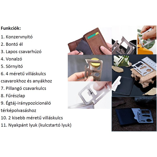 túlélő kártya, 11 funkciós, tokkal; 6,9×4,5×0,2cm, inox