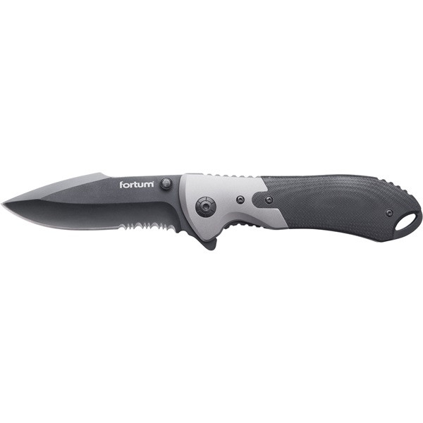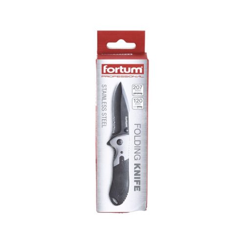 zsebkés, rozsdamentes fekete pengével, teljes/összecsukott hossz:207/120mm, ALU/műa. nyél, övre akasztható, rögzítővel